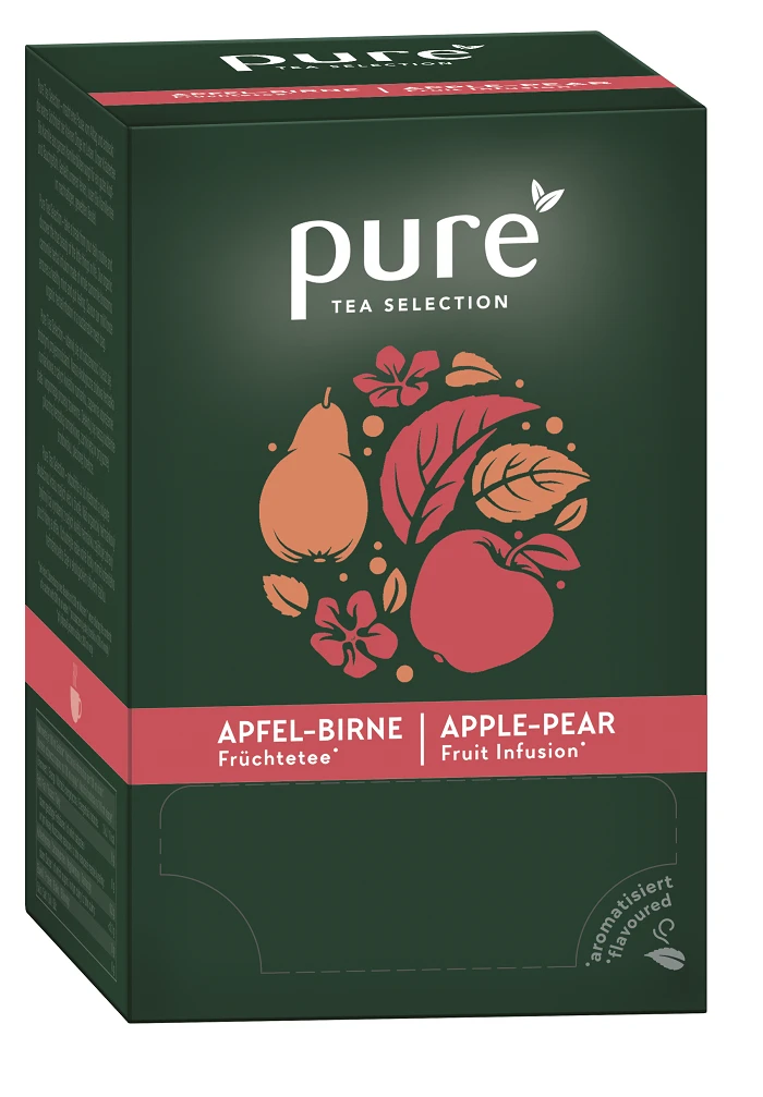 Pure Tea Selection – odpočiňte si od všednosti a objevte skutečnou krásu malých věcí v životě. Náš lehký ovocný čaj jablko-hruška se zralými jablky a aromatickými hruškami chutná jako osvěžující ovocný salát s nádechem exotiky ze sladkých kousků papáji. Vychutnejte si naši směs volných lístků lehkého čaje v ekologické síťovém sáčku.